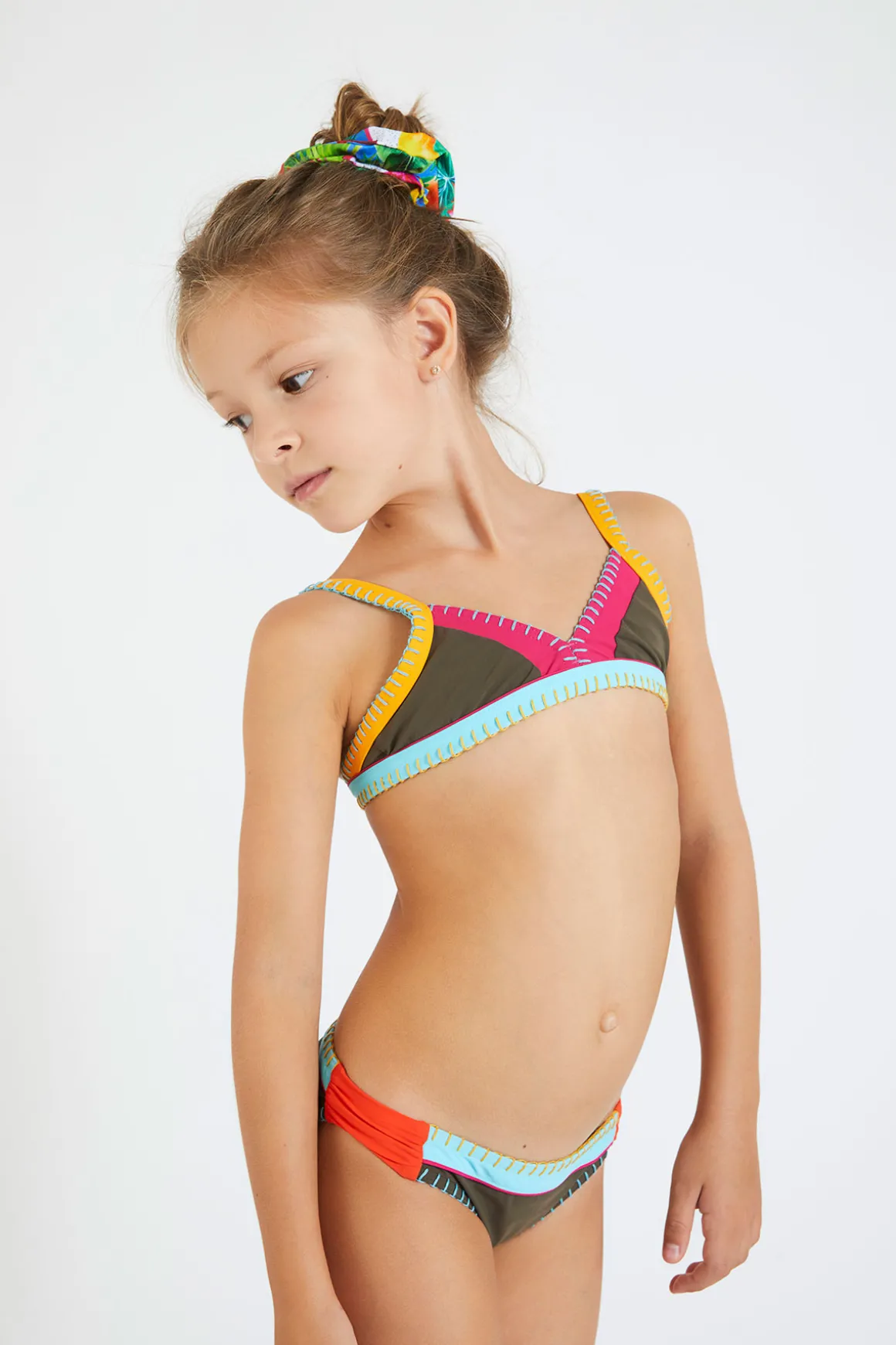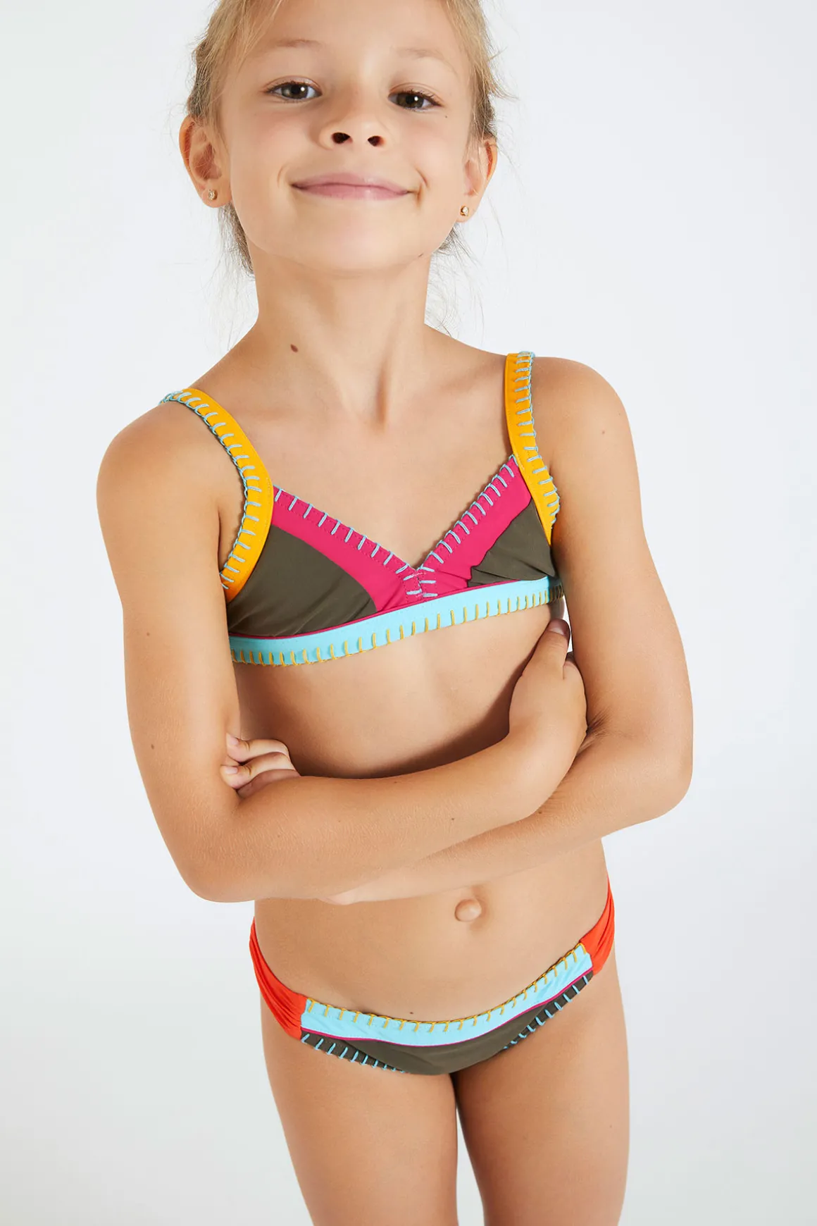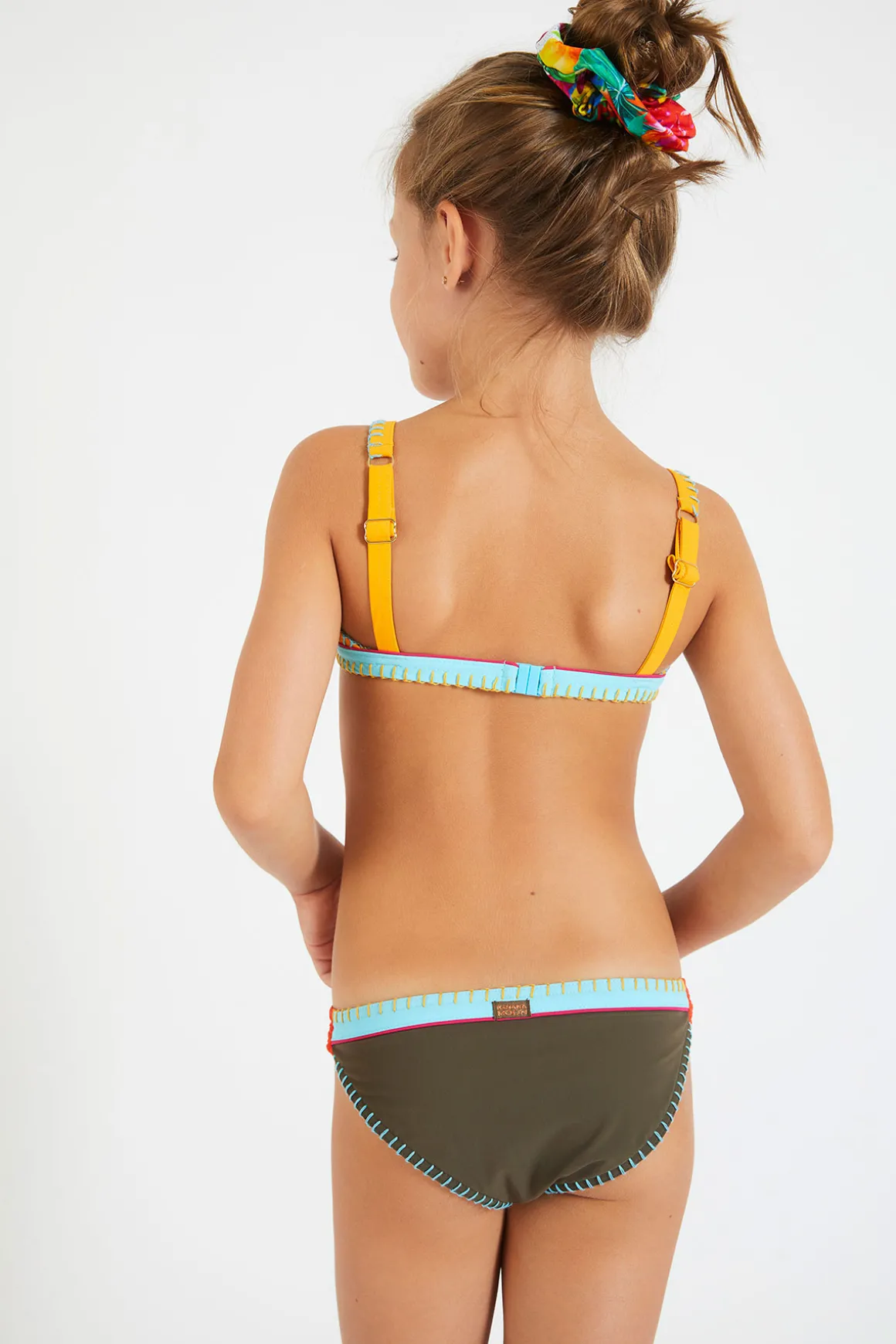 | Détails | • Maillot de bain 2 pièces enfant • Coloris kaki « colorblock » • Surpiqûres colorées • Bretelles réglables • Fermeture dos clip • Giulia mesure 1.30m et porte du 8 ans |