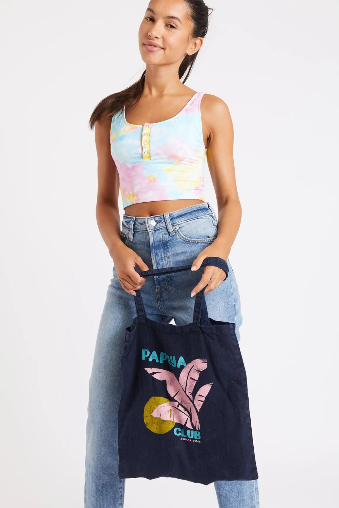 | Détails | • Totebag • 100% lin • Coloris bleu marine • Imprimé Papaya Club • Dimensions : 40cm x 37cm |