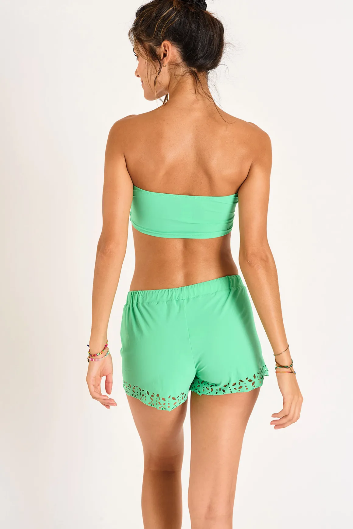 | Détails | • Short femme • Taille élastique • Cordon de réglable • Découpes laser • Détails de pompons • Matière maillot de bain • Collection Écoresponsable avec Sensitive Eco System, où chaque étape de la production est optimisée et tracée pour réduire au maximum l’impact environnemental |