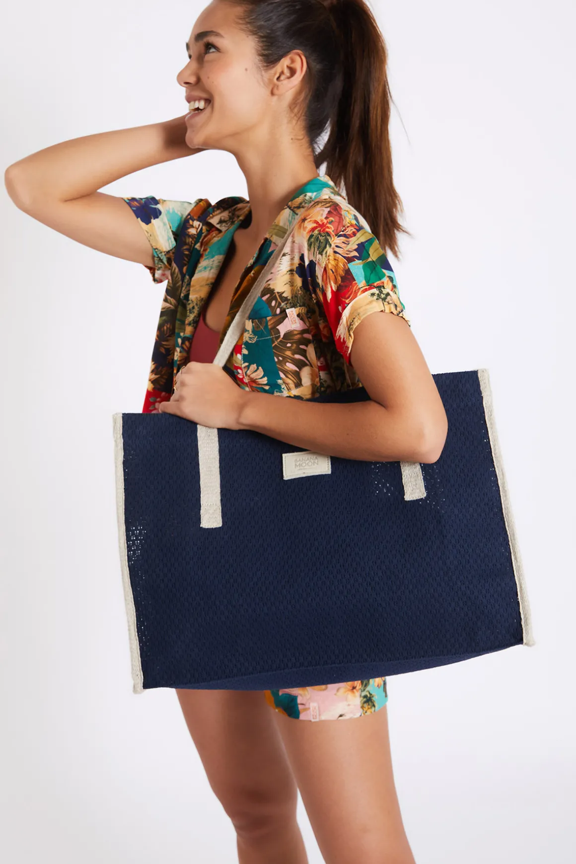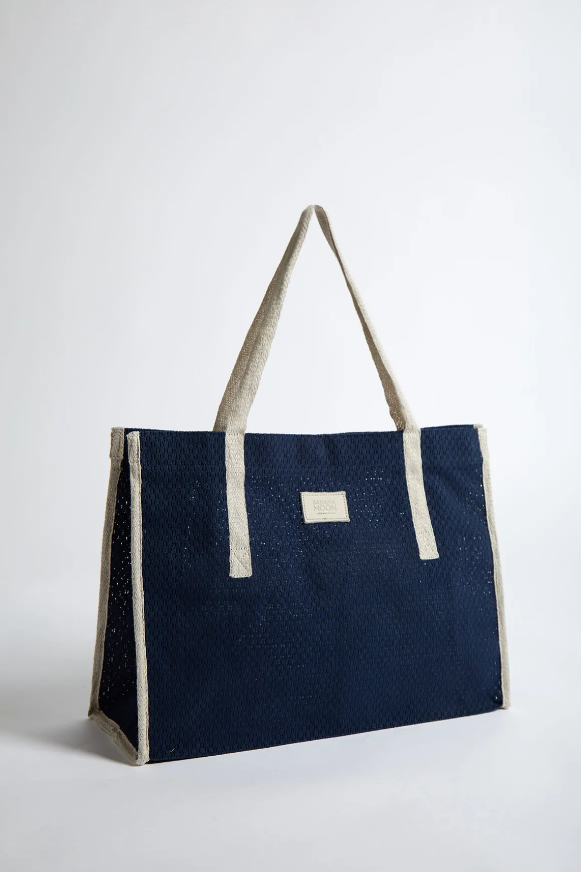 | Détails | • Cabas de plage souple en coton • Coloris bleu marine • Anses écrues • Fermeture par une pression centrale • Dimensions : 35 x 47 cm |