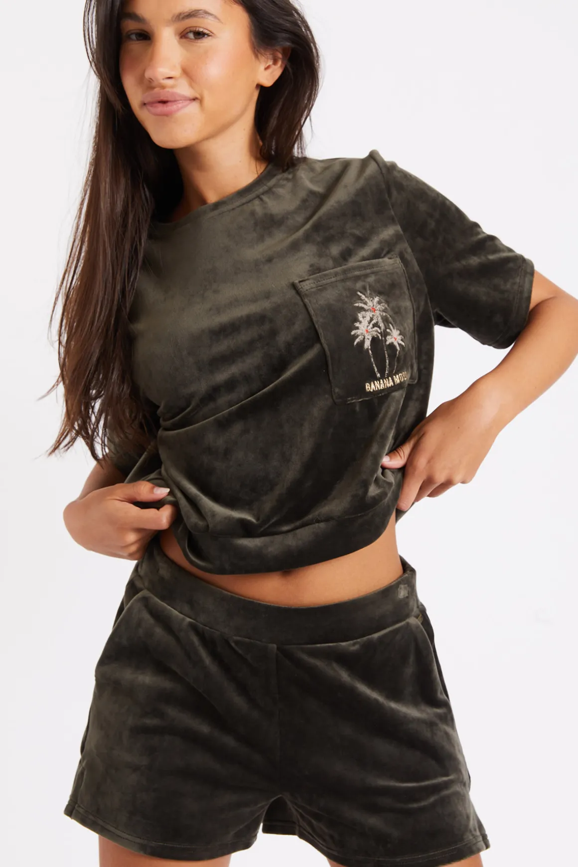 | Détails | • T-shirt femme manches courtes • Velours • Poche avant • Broderie palmier |