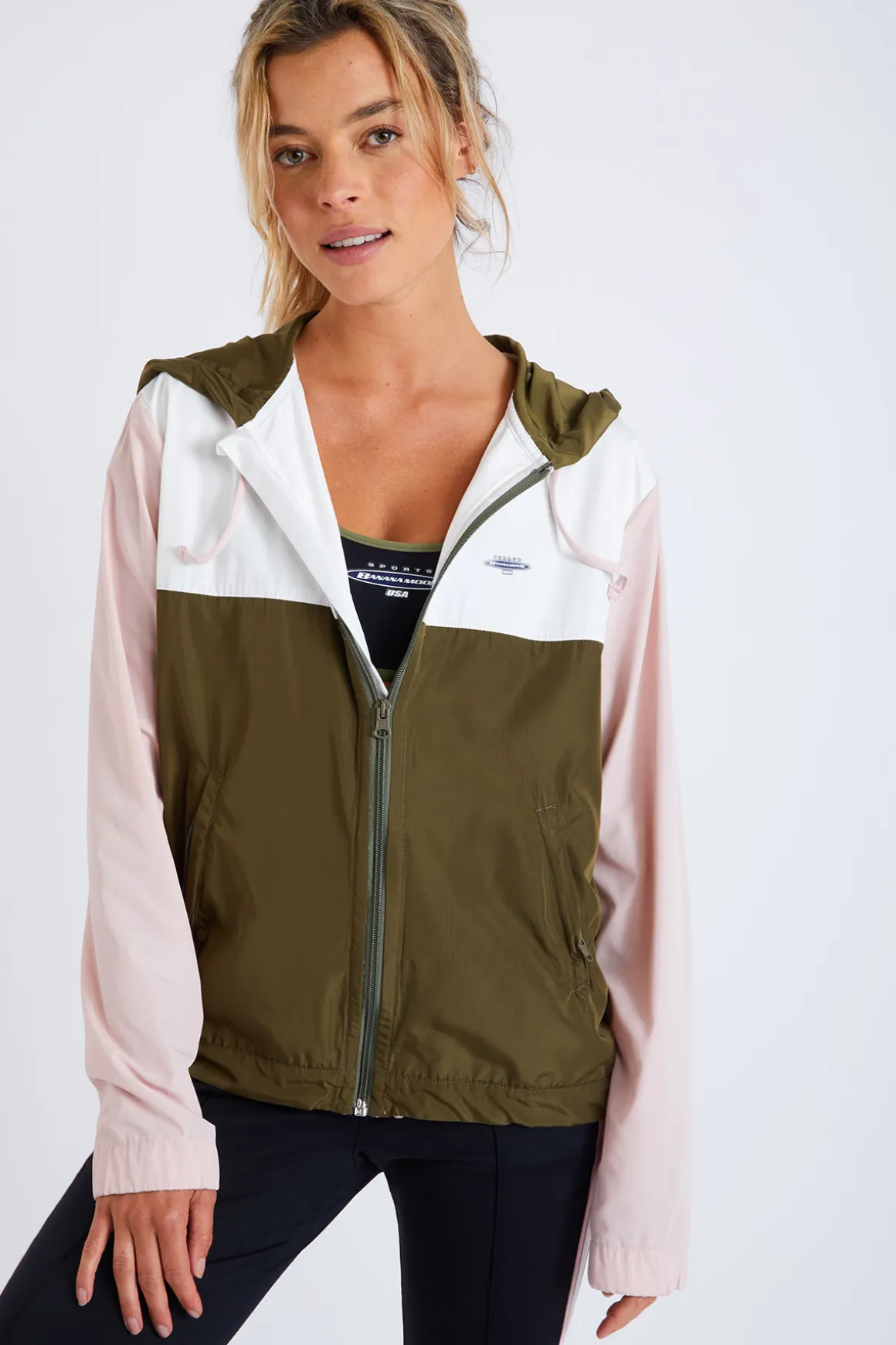 | Détails | • Veste de running • Coloris kaki, blanc et rose clair • Deux poches • Fermeture à zip • Capuche • Effet coupe-vent • La mannequin mesure 1,72 m et porte une taille 36/S |